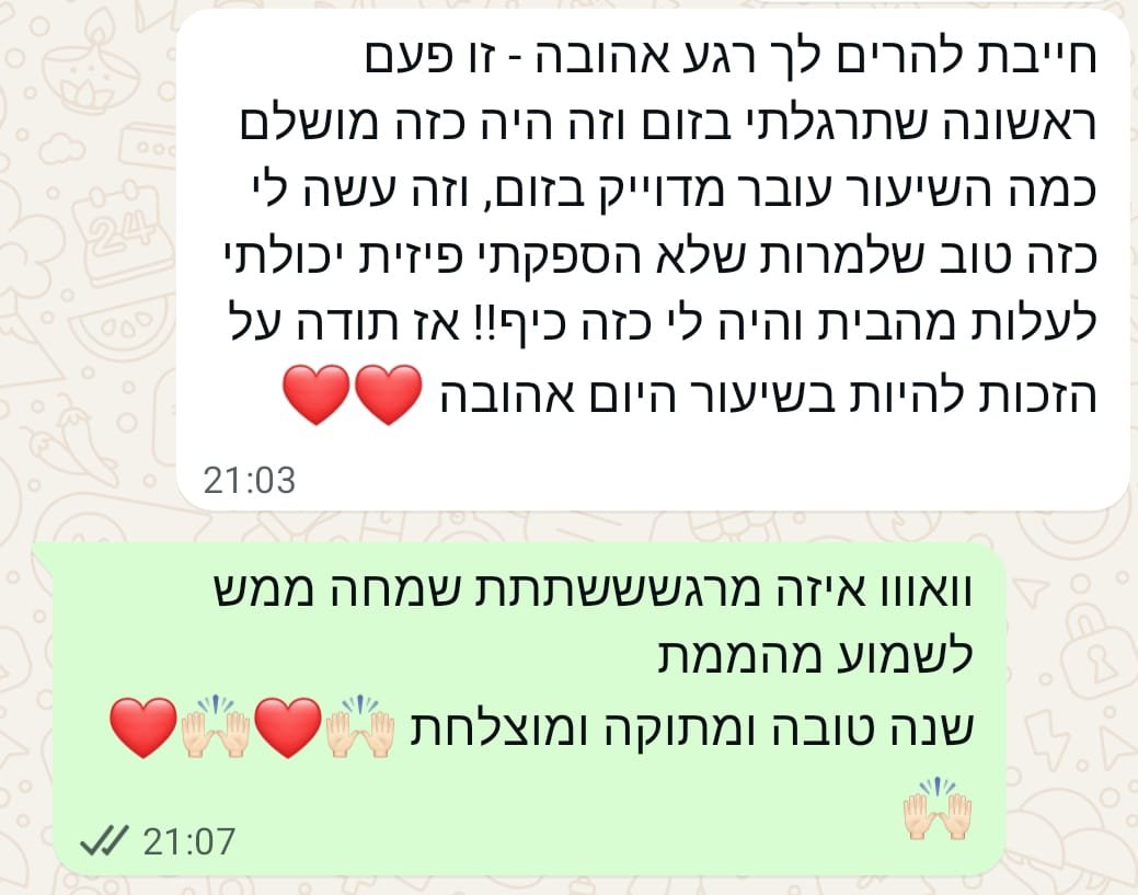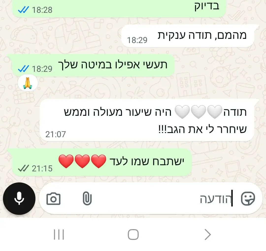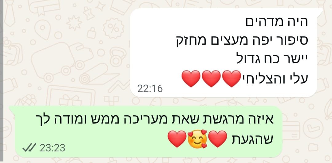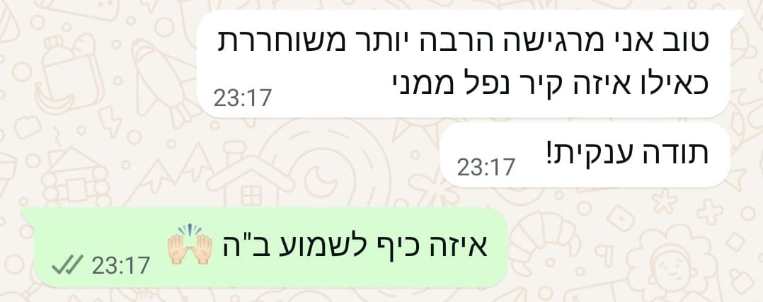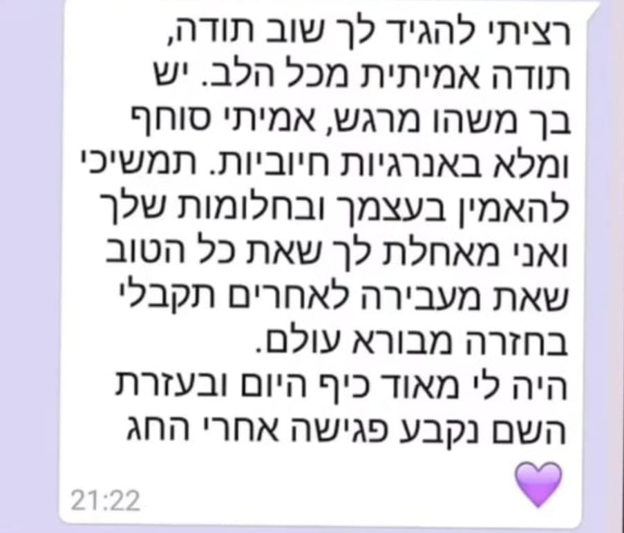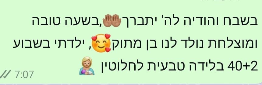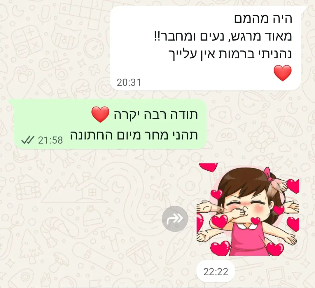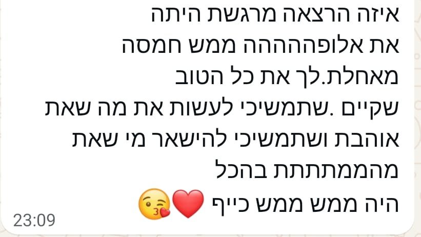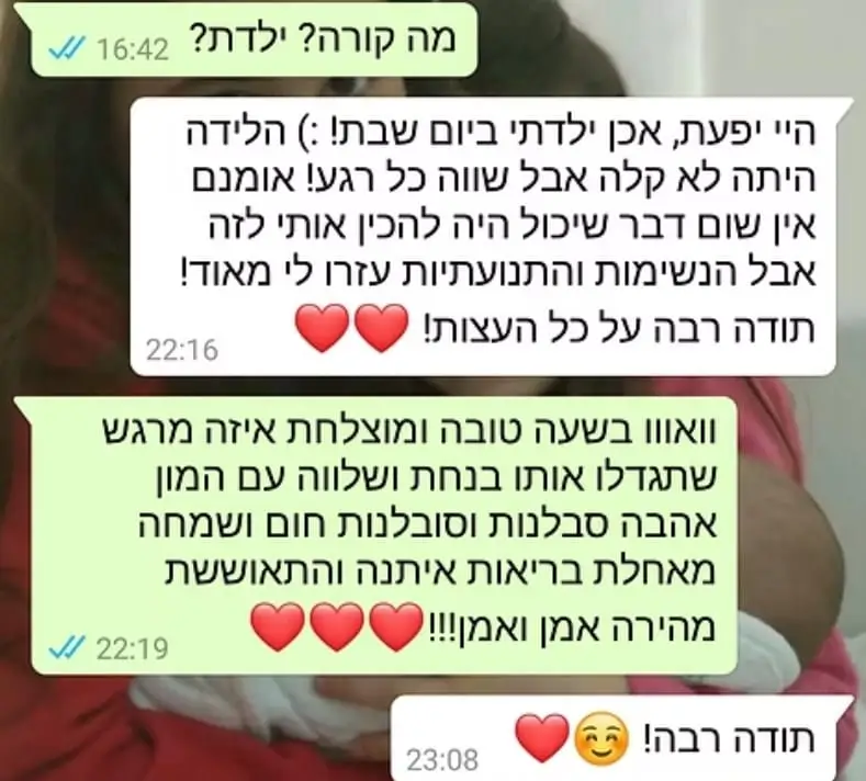 יחס אישי וחם – כל אישה שמגיעה אליי מקבלת הקשבה מלאה, נוכחות אמיתית וליווי בגובה העיניים, מתוך רגישות, אכפתיות וחיבור אישי עמוק.