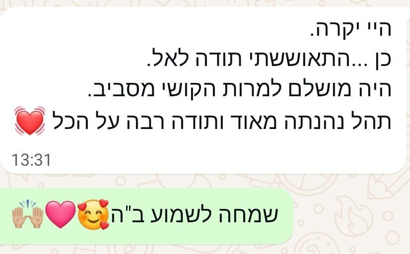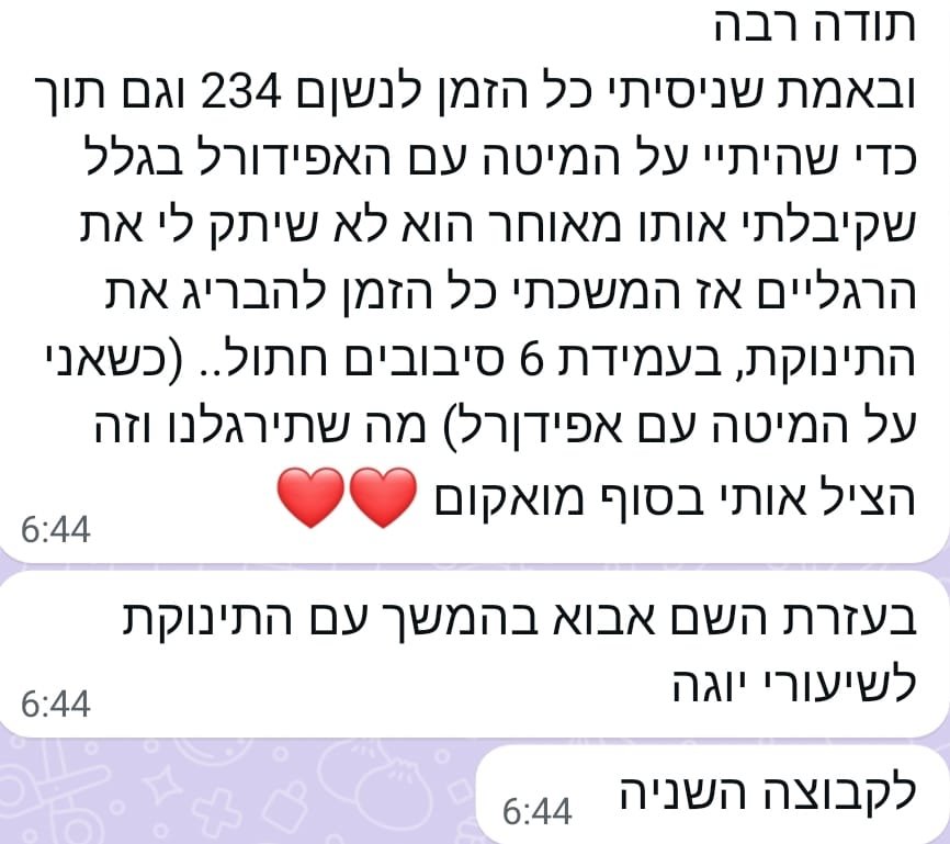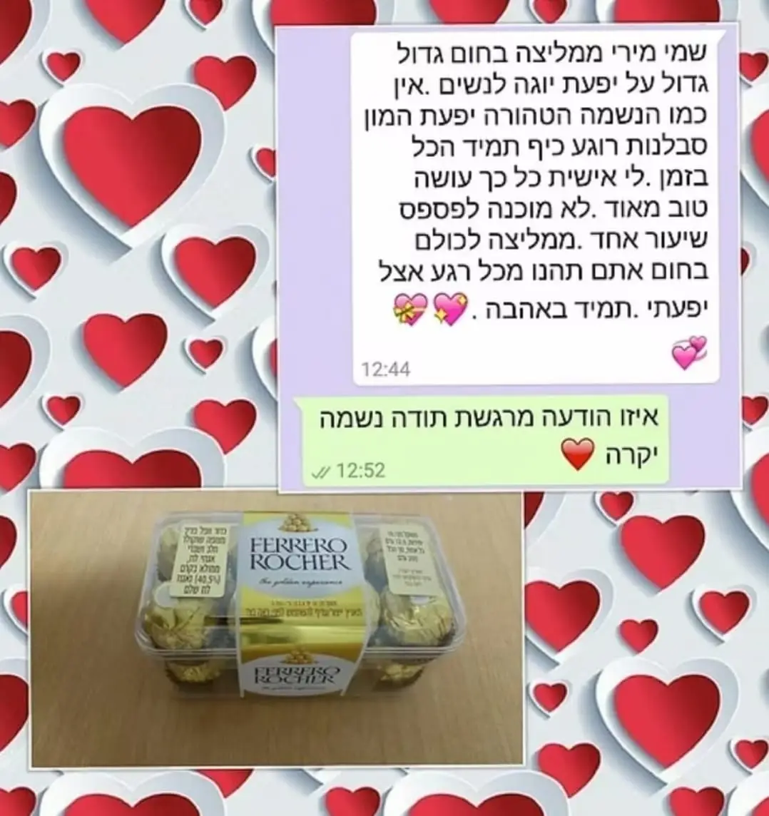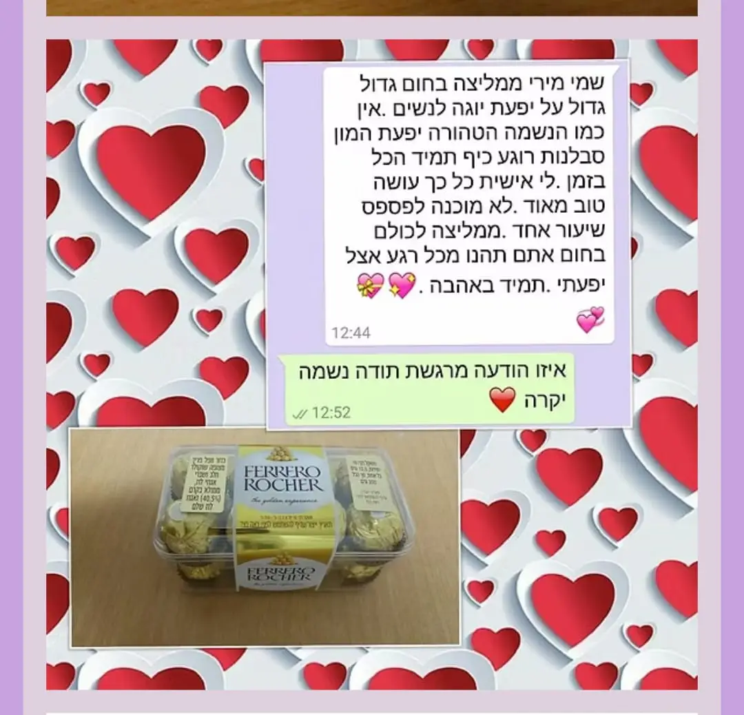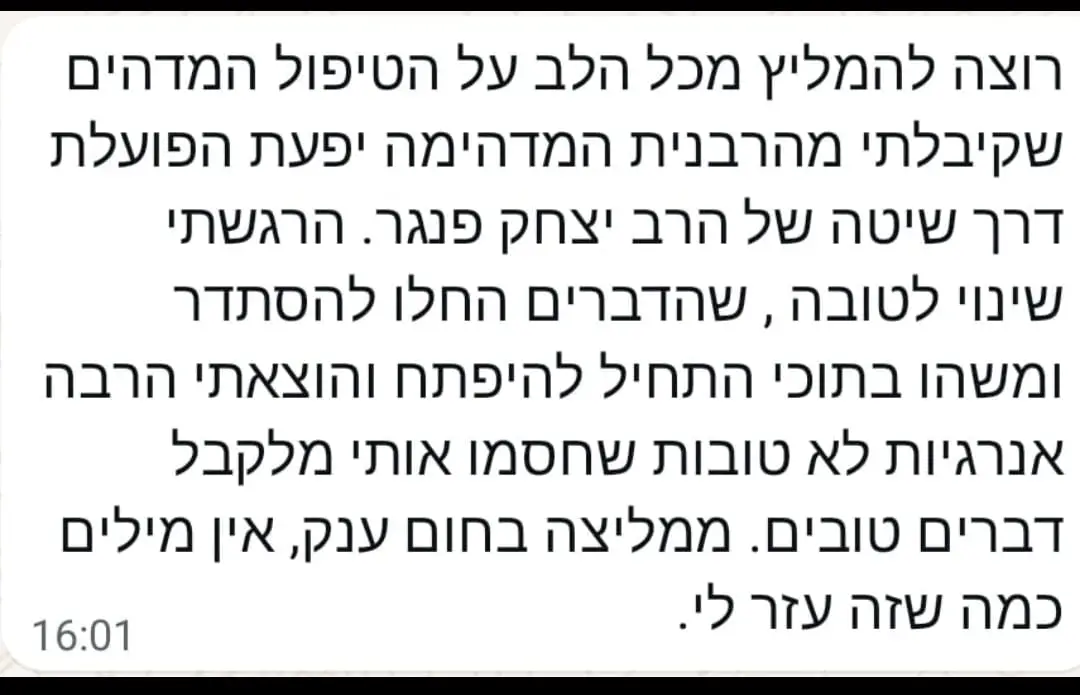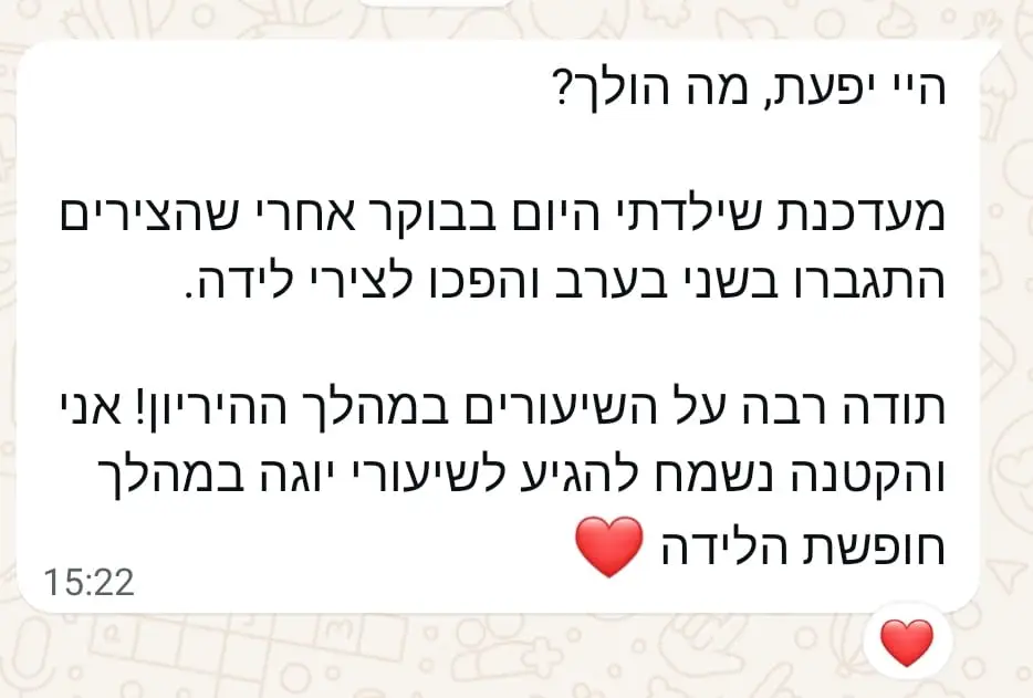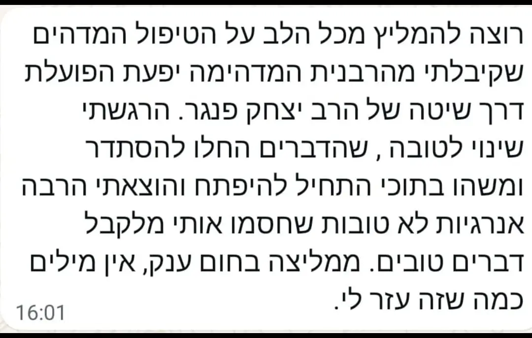 יחס אישי וחם – כל אישה שמגיעה אליי מקבלת הקשבה מלאה, נוכחות אמיתית וליווי בגובה העיניים, מתוך רגישות, אכפתיות וחיבור אישי עמוק.