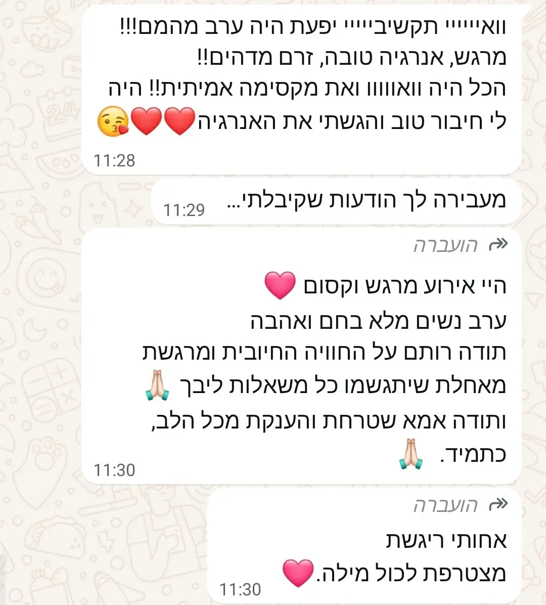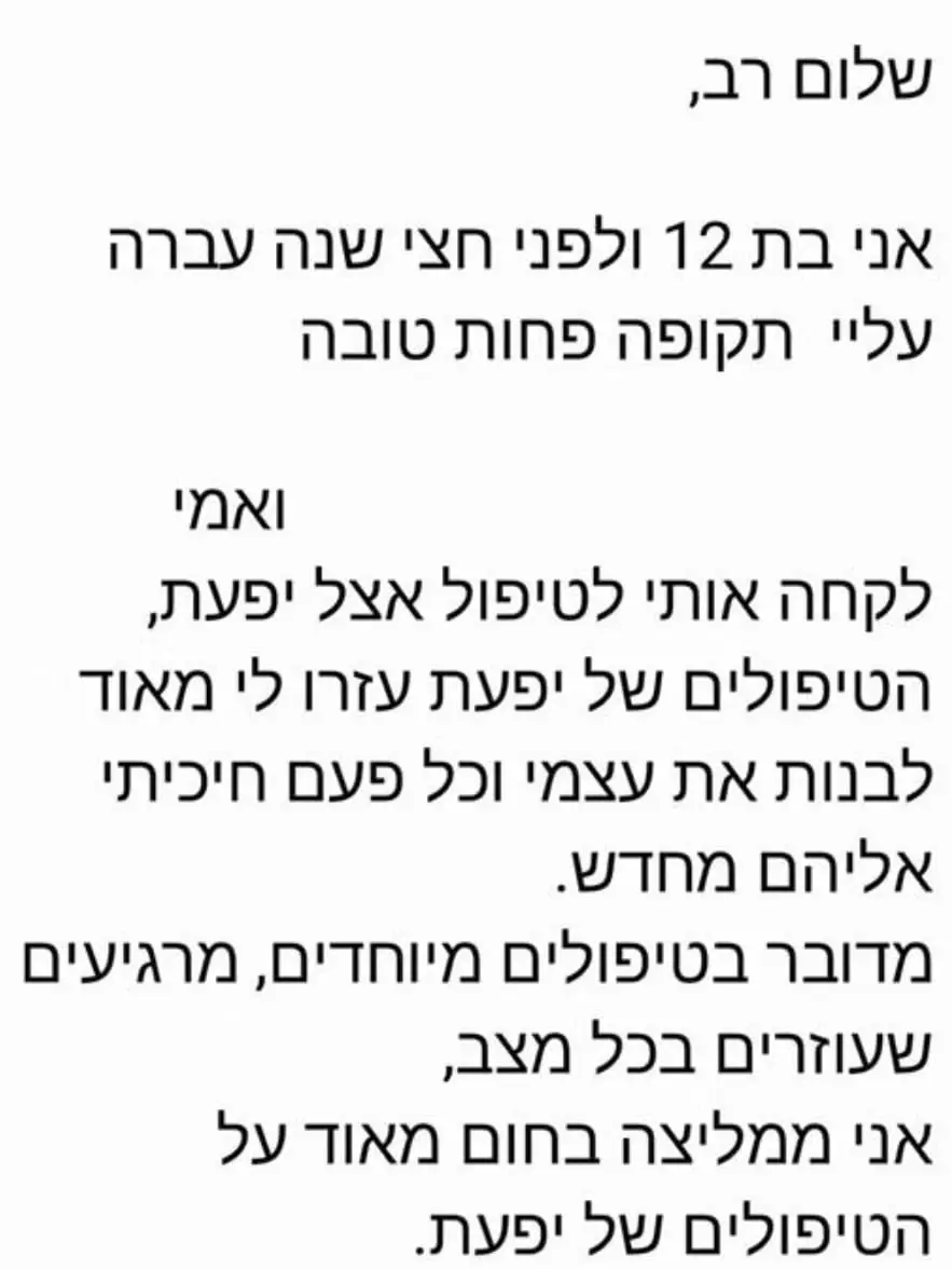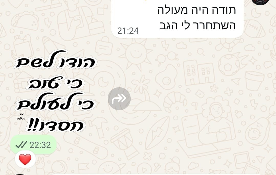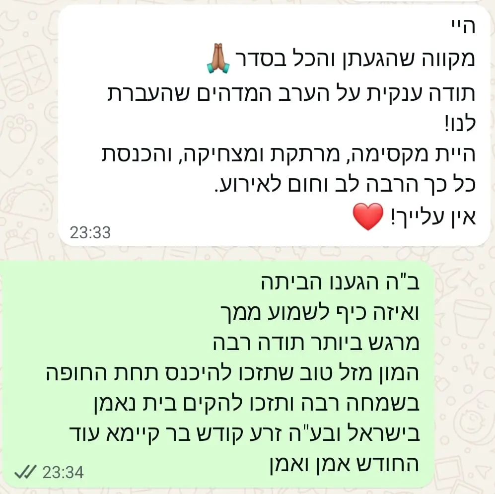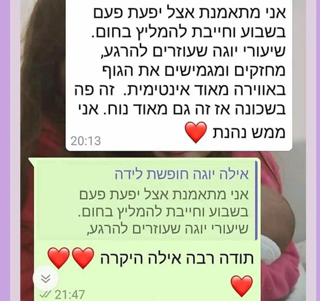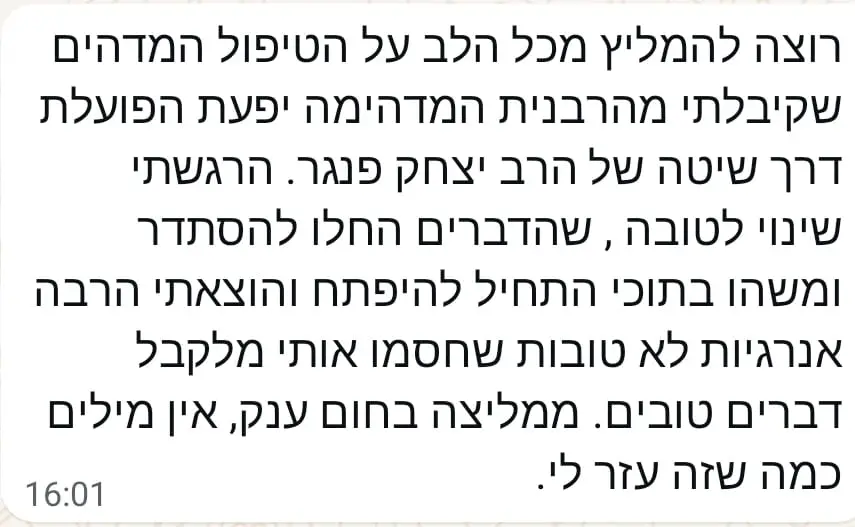 יחס אישי וחם – כל אישה שמגיעה אליי מקבלת הקשבה מלאה, נוכחות אמיתית וליווי בגובה העיניים, מתוך רגישות, אכפתיות וחיבור אישי עמוק.
