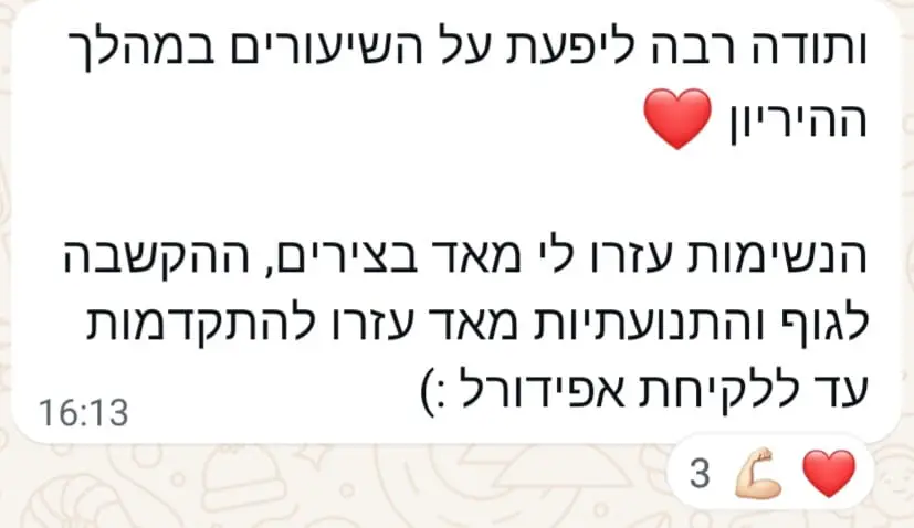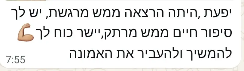 חיזוק באמונה ובביטחון – אני מחזקת כל לקוחה באמונה ובביטחון בהצלחה ובהגעה למטרה, מתוך ראייה חיובית ואמונה בכוחות הפנימיים שלה.