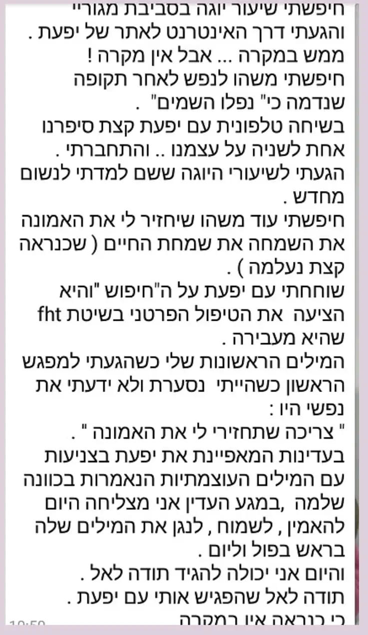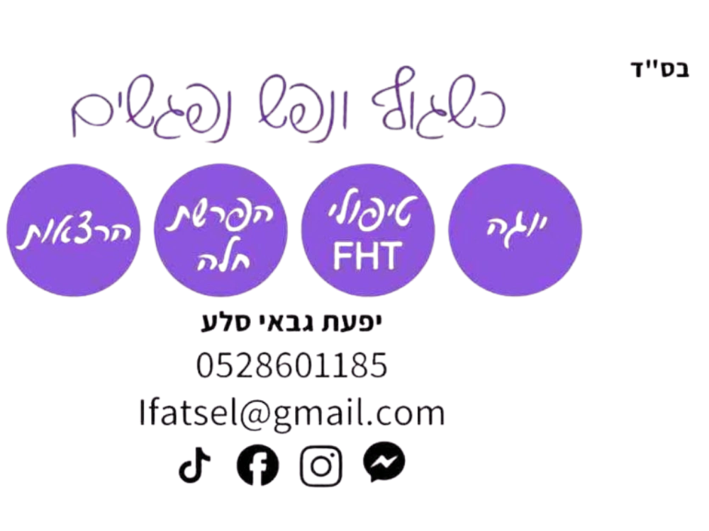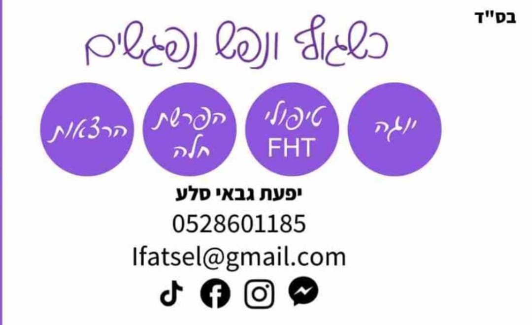 כשגוף ונפש נפגשים – יפעת גבאי סלע הוא מרחב טיפולי ורוחני המחבר בין ריפוי עמוק, תנועה מודעת ואמונה – במטרה לאפשר לכל אישה לפרוץ מחסומים ולחיות חיים שלמים, בריאים ומלאי משמעות.
