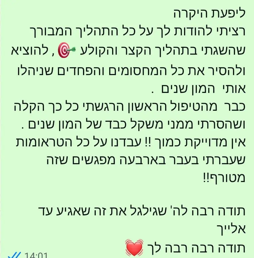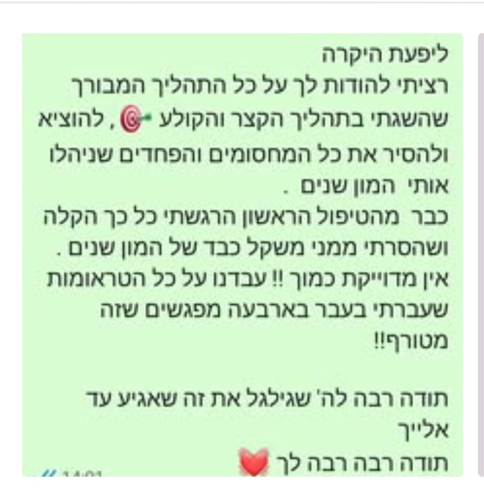 שליחות – אני רואה בעבודה שלי שליחות שלשמה באתי לעולם, ופועלת מתוך מחויבות פנימית עמוקה לסייע, לרפא ולחזק.