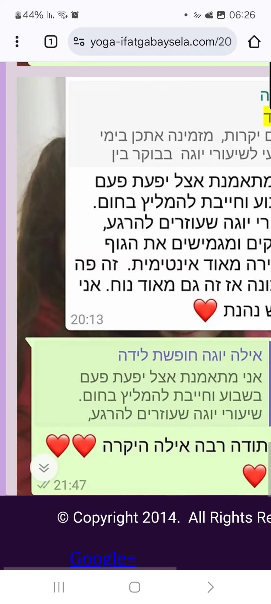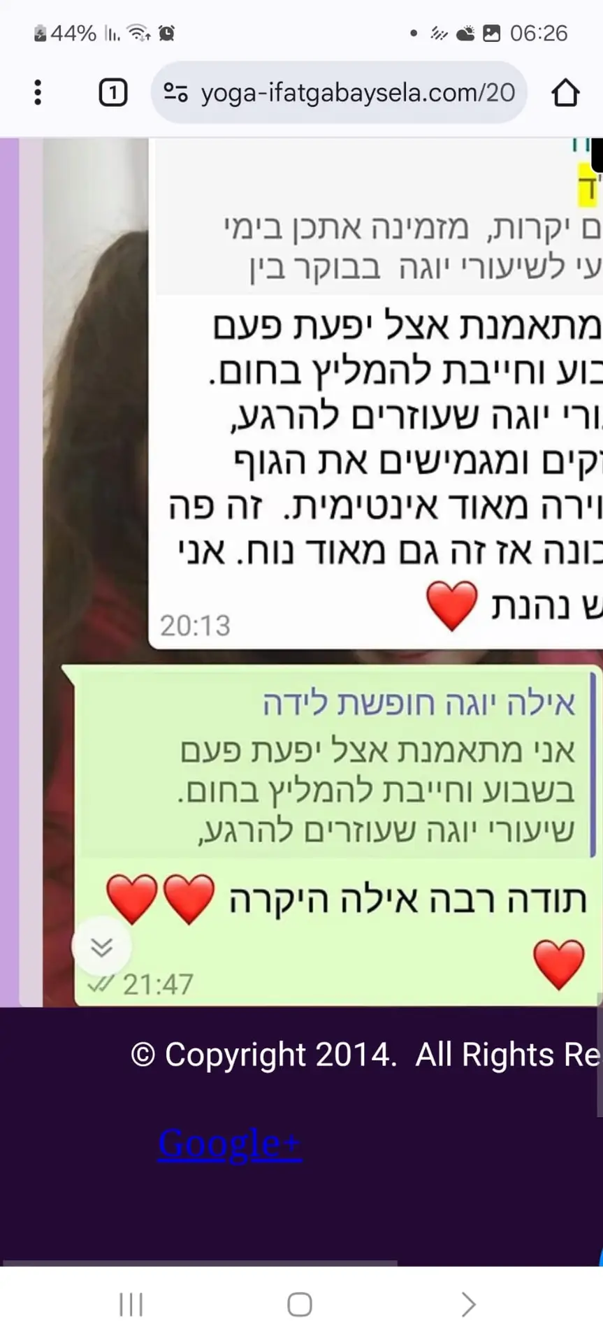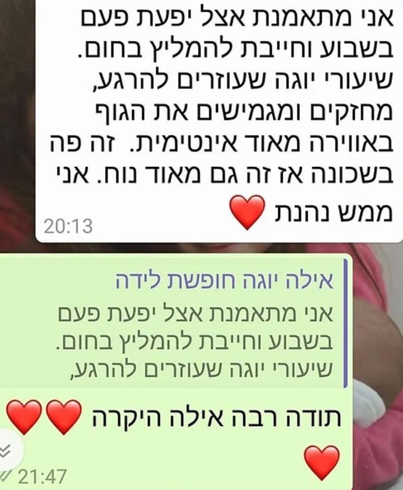 יוגה – שיעורי יוגה לנשים ונשים בהריון, וכן שיעורים פרטיים בשיטת ויגנאננה לחיזוק שרירי הגוף והליבה. השיעורים מתקיימים בפתח תקווה, בקבוצות קטנות ועם יחס אישי.