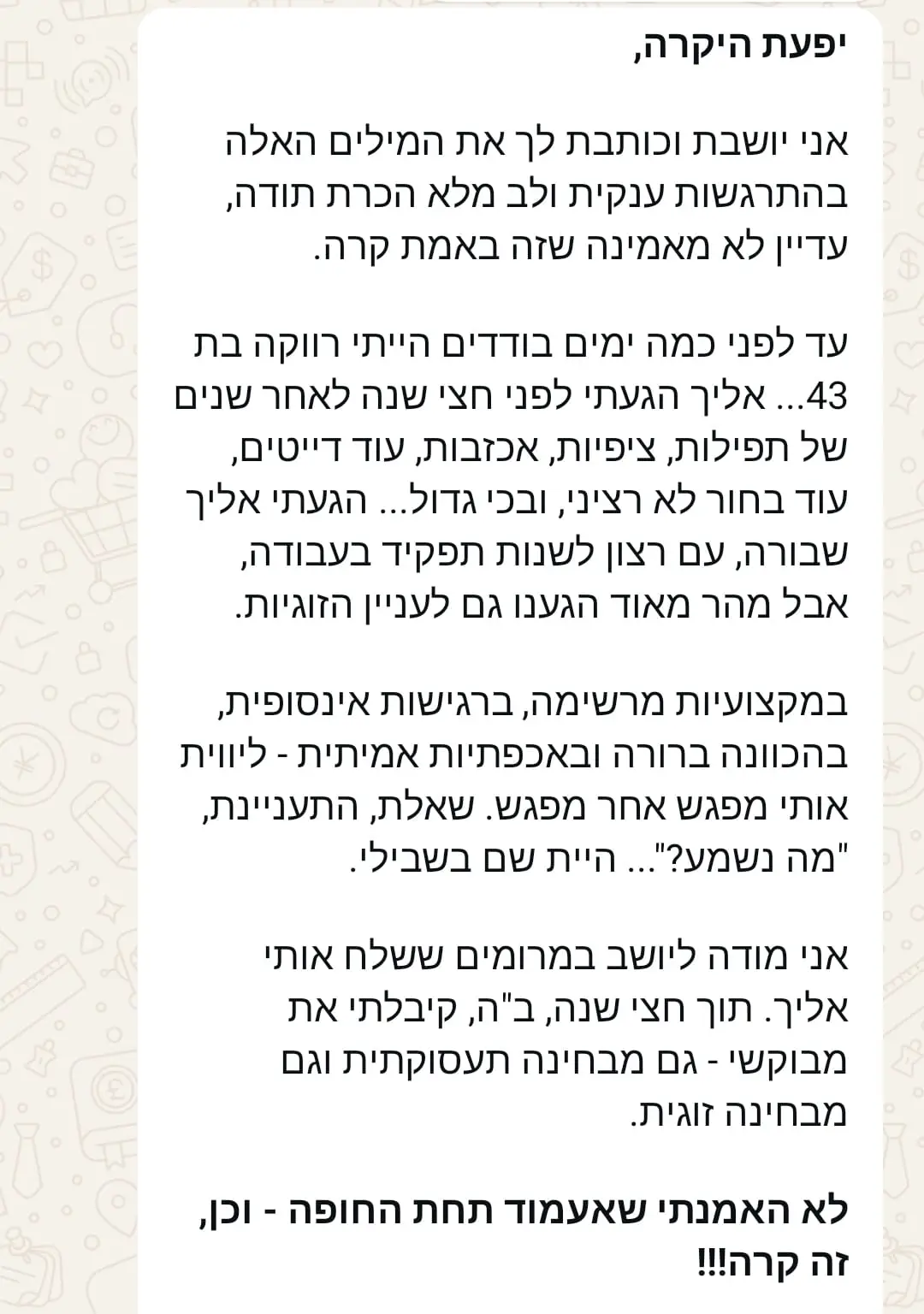 במהלך ההרצאה אני משתפת כיצד דווקא ברגעים שבהם הכול נראה סגור – נפתחה דלת, הופיעה הצעה בלתי צפויה, והדרך התבהרה באור חדש. זהו מסע של חיזוק האמונה, חיבור פנימי, בניית ביטחון עצמי וראיית הטוב גם במצבים מורכבים.